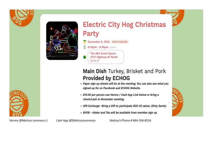 864 Event Space 3737 N Hwy 81 Ste B Anderson, SC 29621 $10 Per person Charge to help cover expenses. Hog Club to provide meats and members will bring covered dishes.